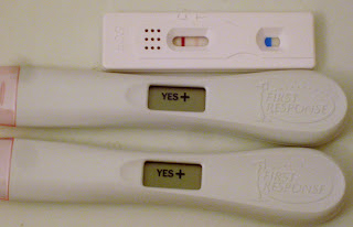 Just as I suspected, this morning I took 3 pregnancy tests. All of which came back POSITIVE! Yay! I unfortunately couldn't think of a clever way to tell my husband so soon, so I just grabbed 2 pieces of paper and wrote on one, "GUESS WHAT...", and showed him. He said, "What's on the next piece of paper?" So, on the second I wrote, "WE'RE PREGNANT!" He asked how I knew and I showed him the 3 tests. :)